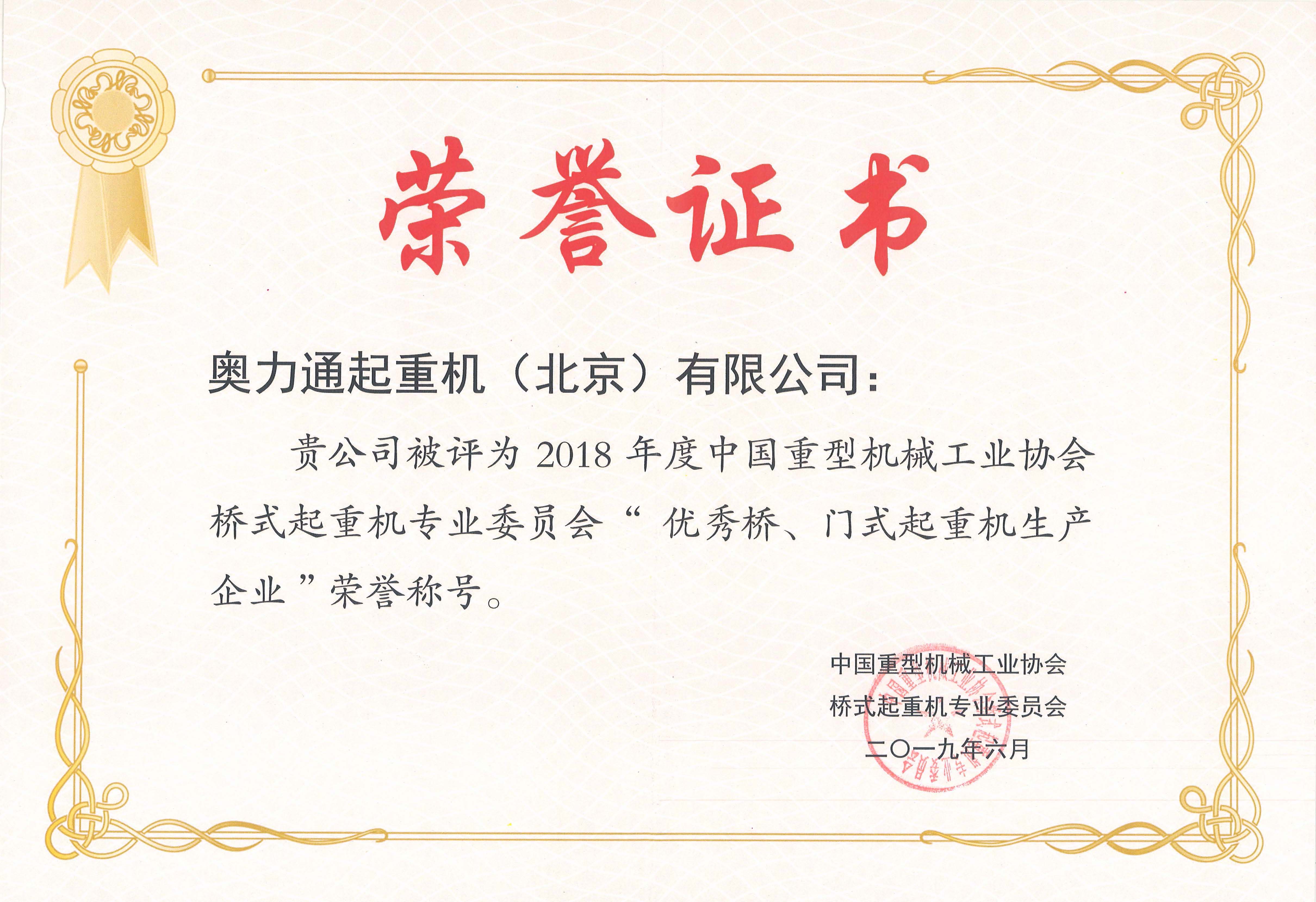 奥力通荣获2018年度“优秀桥、门式起重机生产企业”