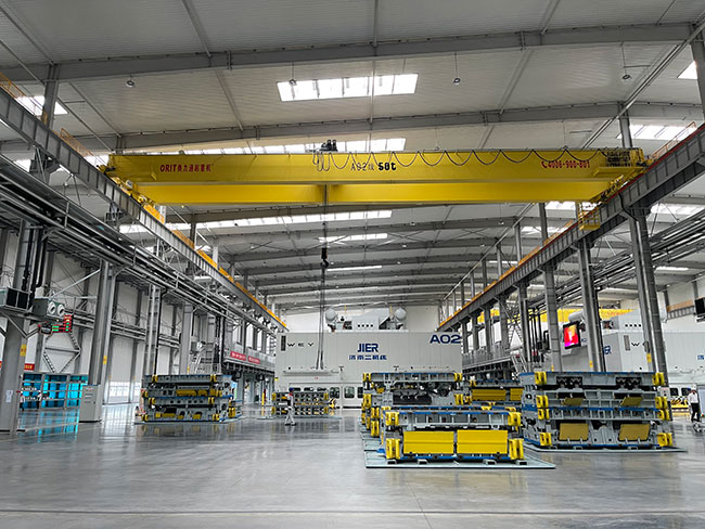 IM电竞为扬力集团冲压机床产品量身定制多钩协同、重载大斜拉起重机,即“重型机床翻转专用起重机”,采用世界上最先进的“多购协同、大斜拉”独到设计,全车采用PLC控制、全变频调速、并配置故障自诊断和安全监控功能,先进的技术确保客户床身翻转稳稳当当、安安全全!该起重机应用于扬力集团的智能汽车冲压线生产制造车间。