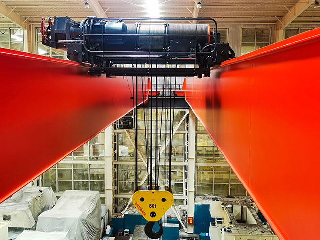 该起重机起重量达到180t,多钩协同翻转重型机床床身,全变频无级调速、自适应大角度斜拉,操作简单、运行平稳,彻底改变了大型重机制造行业危险度极高的床身翻转工艺,彻底消除了重型机床床身翻转安全隐患。获得客户扬力集团好评!