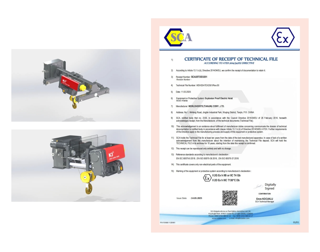 ATEX认证不仅是欧盟市场的准入标准,更被中东、东南亚等地区广泛采信。这一认证的获得,将助力IM电竞快速进入欧洲化工、石油、制药等高附加值行业,为全球客户提供更安全、更可靠的起重解决方案。