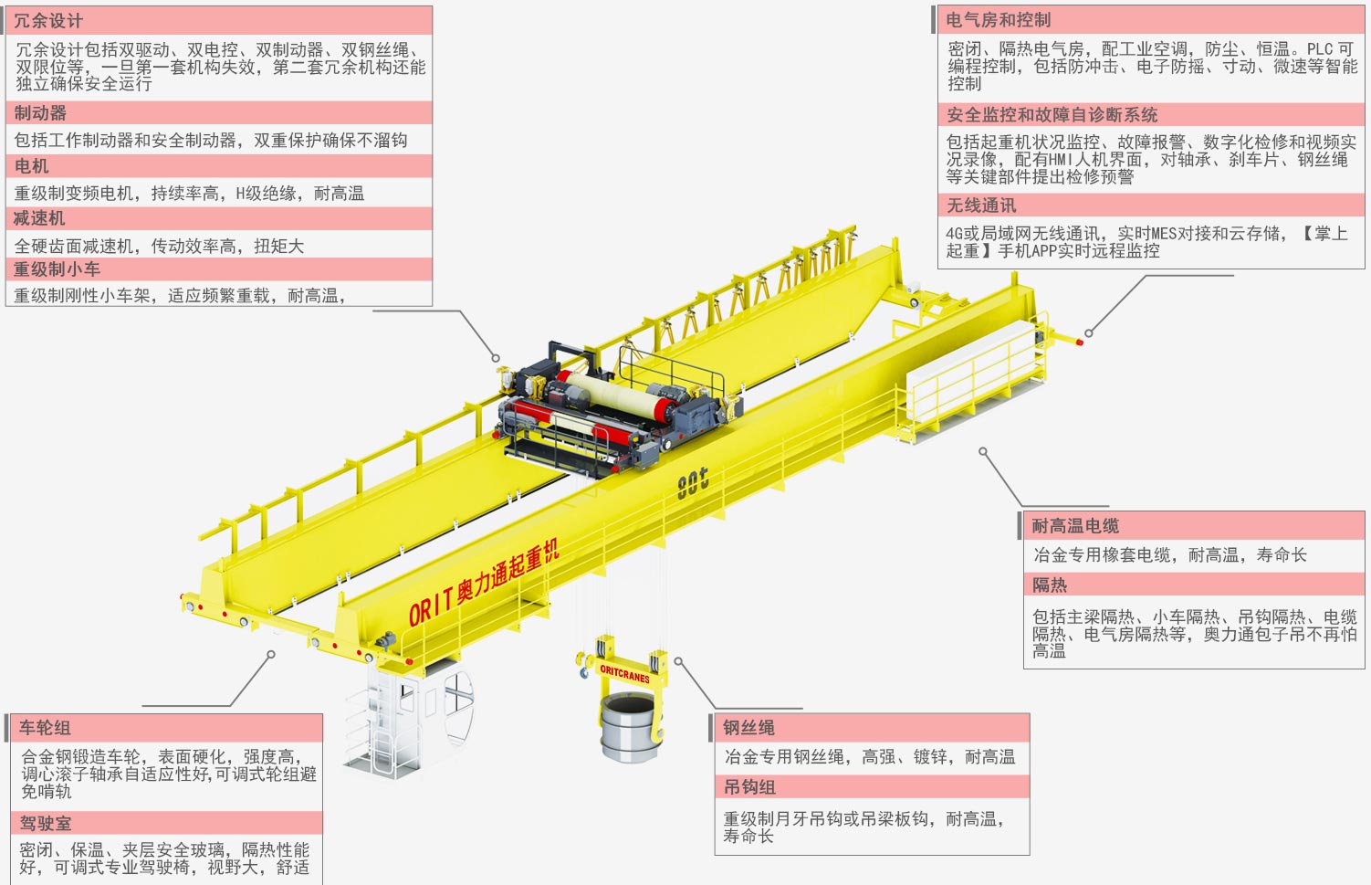 钢丝绳 冶金专用钢丝绳,高强、镀锌,耐高温 吊钩组 重级制月牙吊钩或吊梁板钩,耐高温,寿命长