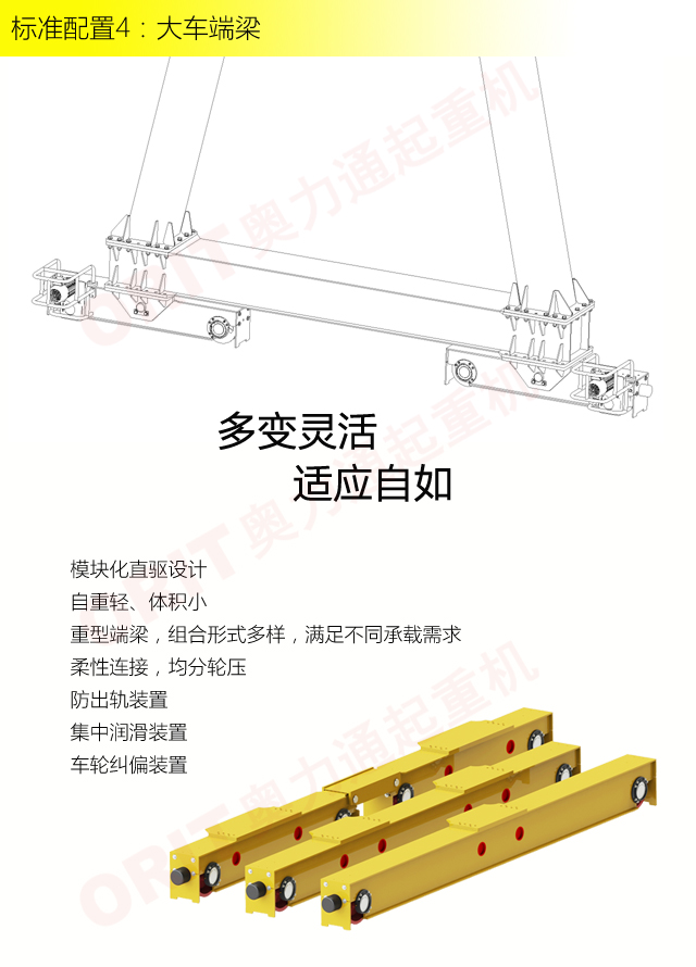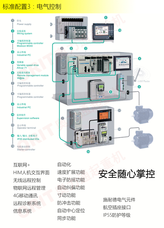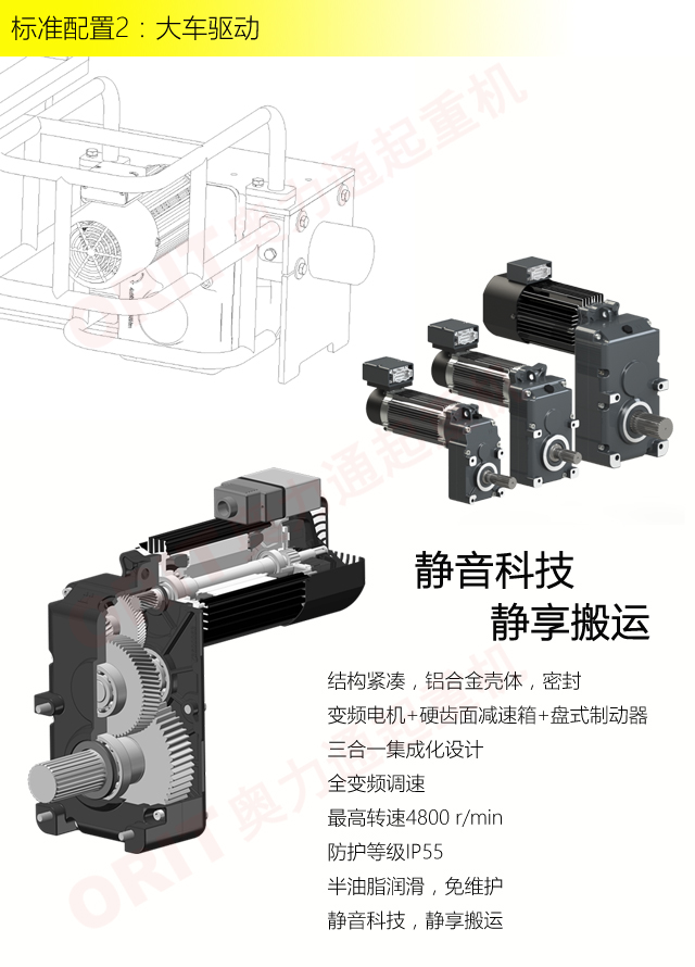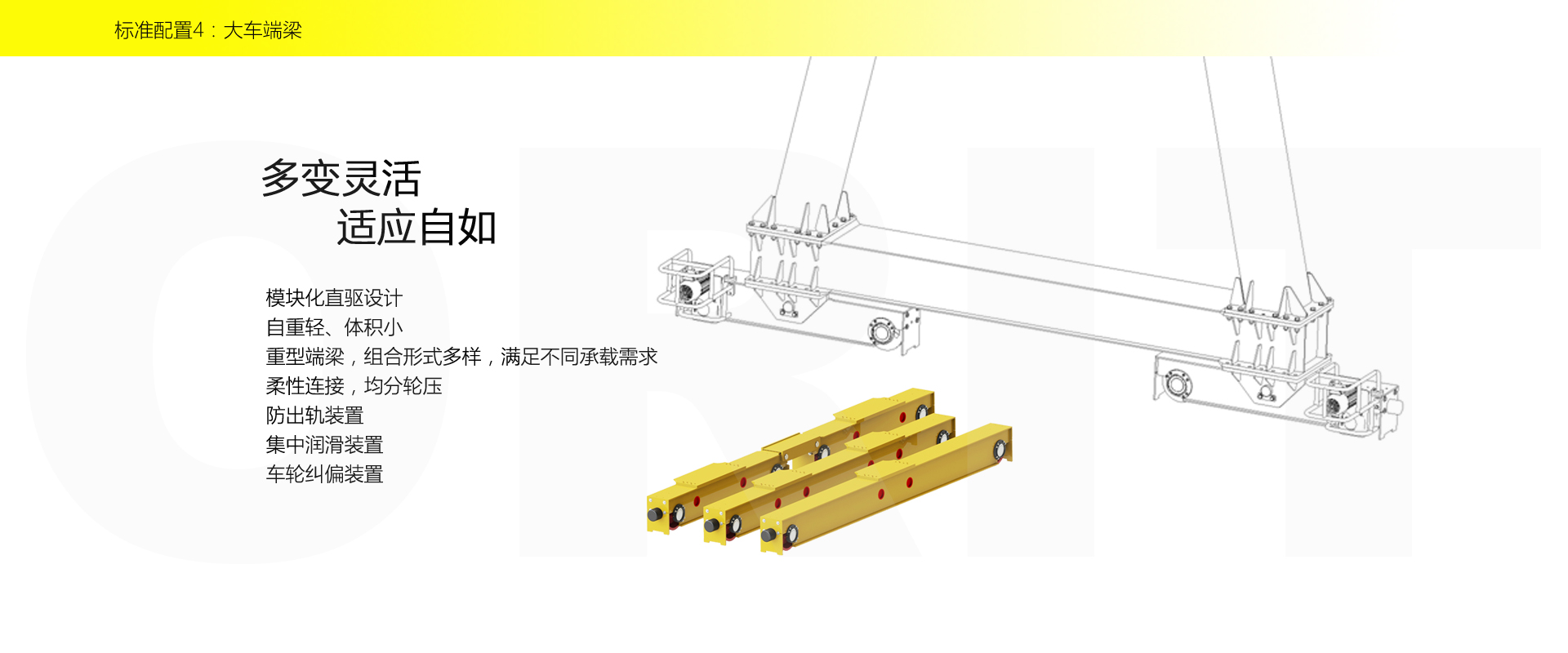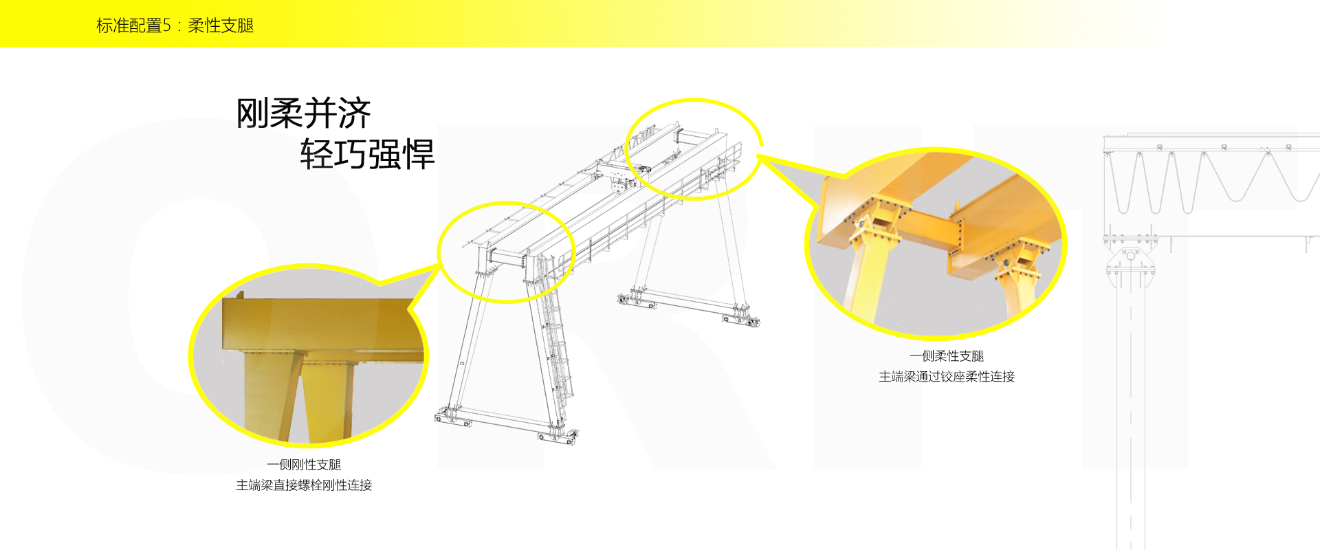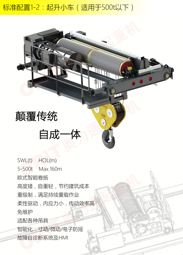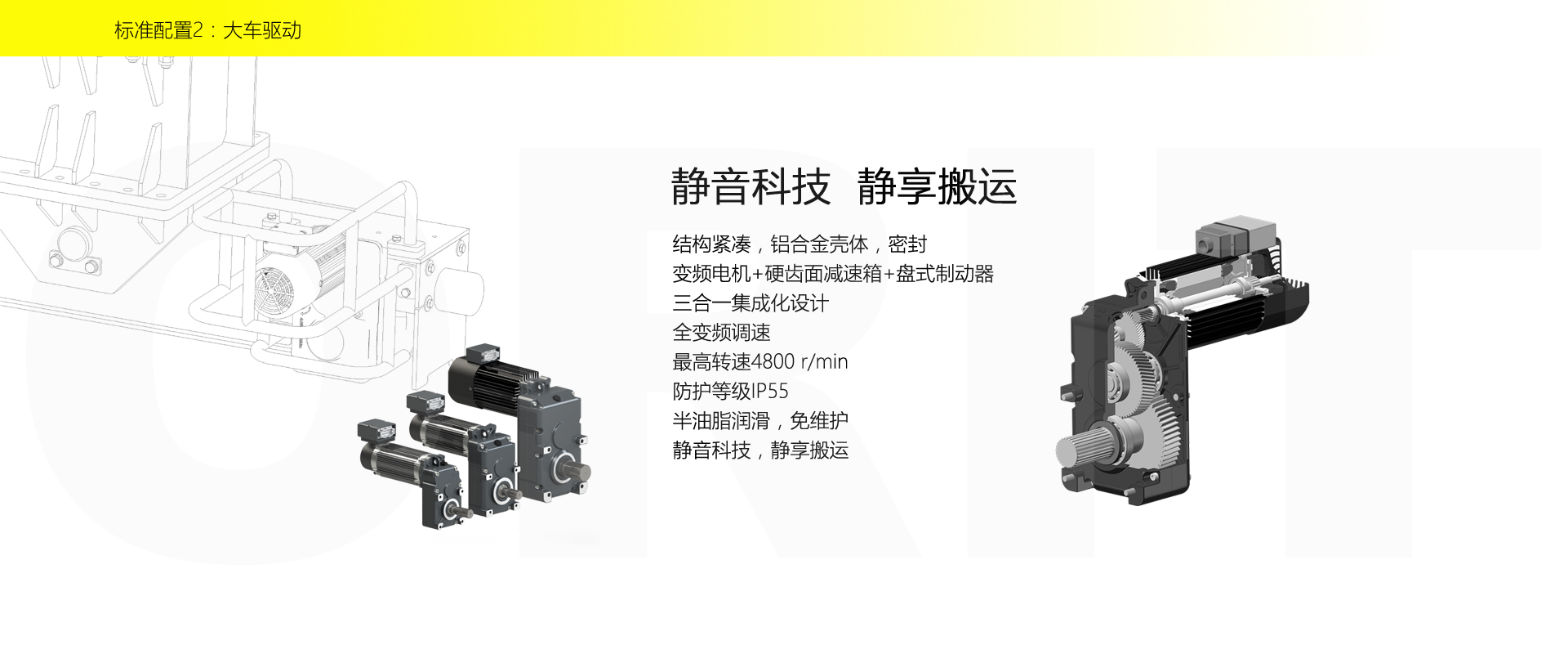 产品名称:双梁门式起重机 刚柔并济 小体积 大能耐 优化设计,结构紧凑 柔性支腿,有效释放应力,延迟结构寿命 柔性支腿,体积小,节省空间 变频控制,运行平稳 实时安全监控,确保吊运安全 标准化配置,让性能无比稳定 配置K系起升,适用于80t以下额定载荷 无牛腿车间搬运的最佳解决方案 配置CM智能卷扬起升,适用于500t以下额定载荷起吊 标准配置1-1:起升机构 SWL(t) HOL(m) 0.8t-80t Max.90m 低净空设计 柔性驱动,内应力小,传动效率高 柔性铰接小车架 重级制电机,接电持续率60%ED 行走变频无极调速,运行平稳 自调试电磁盘式制动器,可靠,防尘 2160N/mm² 高强度镀锌钢丝绳,免维护 全周型导绳器,防松绳 全系标配安全监控系统 标准配置1-2:起升机构 颠覆传统,自成一体 SWL(t) HOL(m) 5-500t Max.160m 欧式智能卷扬 高度矮,自重轻,节约建筑成本 重级制,满足持续重载作业 柔性驱动,内应力小,传动效率高 免维护 适配各种吊具 智能化:寸动/微动/电子防摇 故障自诊断系统及HMI 标准配置2:三合一驱动 静音科技,静享搬运 结构紧凑,铝合金壳体,密封 变频电机+硬齿面减速箱+盘式制动器 三合一集成化设计 全变频调速 最高转速4800 r/min 防护等级IP55 半油脂润滑,免维护 静音科技,静享搬运 标准配置3:电控系统 安全随心掌控 互联网+ HIM人机交互界面 无线远程控制 物联网远程管理 4G移动通讯 远程诊断系统 信息系统 自动化 速度扩展功能 电子防摇功能 自动纠偏功能 寸动功能 防冲击功能 自动中心定位 同步功能 智能安全监控器 计算起升机构剩余安全工作时间 累计起升工作时间 累计超载次数 累计起升电机启动次数 起升电机过热保护及报警 刹车片厚度报警 ... ... 远程通讯 施耐德电气元件 航空插座接口 IP55防护等级 标准配置4:端梁 多变灵活,适应自如 模块化直驱设计 自重轻、体积小 重型端梁,组合形式多样,满足不同承载需求 柔性连接,均分轮压 防出轨装置 集中润滑装置 车轮纠偏装置 柔性支腿 刚柔并济,轻巧强悍 一侧刚性支腿,主端梁直接螺栓刚性连接 一侧柔性支腿,主端梁通过铰座柔性连接